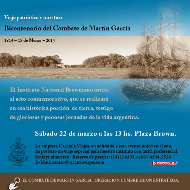 15/1814: Segunda fase del Combate naval de Martín García, en la que el Almirante Brown ocupa la isla. El combate que comenzó tan desfavorable en las jornadas del 10 y 11 de marzo termina con una gran victoria, dividiendo el poderío naval español en dos.