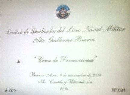 El viernes 17/10/2014 se llevó a cabo en el Círculo de Oficiales de Mar la fiesta del Cadete 2014 del Liceo, organizada por los padres de los cadetes y presidida por el Director de Educación de la Armada -CL Ricardo Christiani- y el Director del Liceo -CN Omar Fernandez-. Concurrieron el Presidente del Centro de Graduados y el Presidente de la Fundación Liceo Naval Almirante Brown. Todos los asistentes fueron obsequiados con un presente como el que se detalla a continuación: