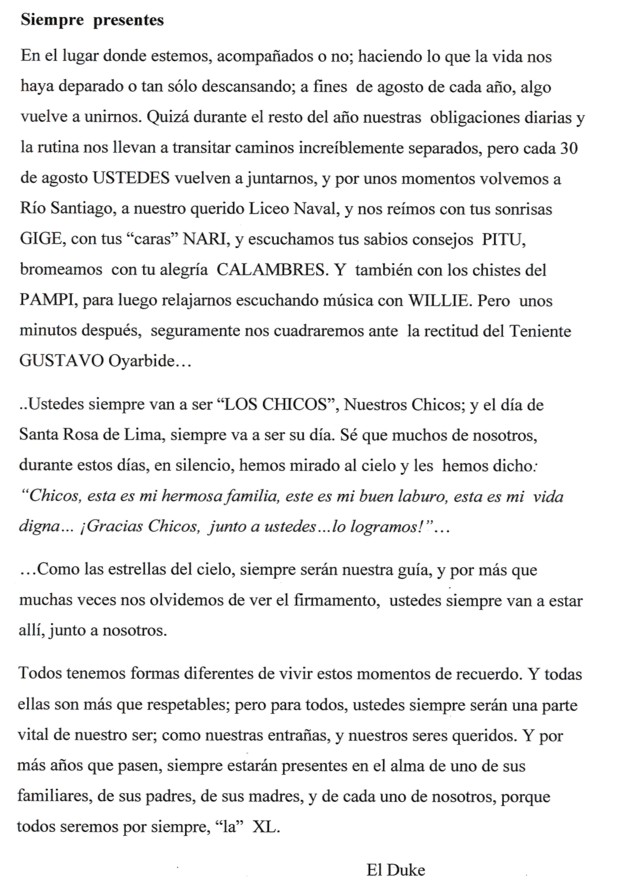 El pasado 4 de septiembre en el Hall de entrada del Liceo Naval Militar Alte. G. Brown se celebro la misa en honor a los cadetes de la promoción 40 que fallecieron el 31 de agosto del año 1991.