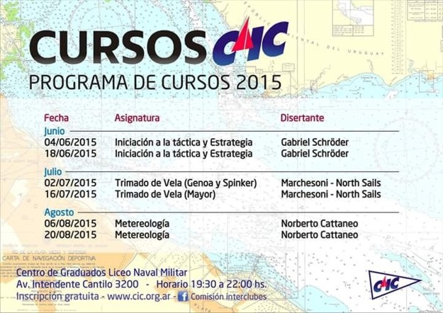 Durante este año se llevaron a cabo en nuestro Centro de Graduados charlas organizadas por las CIC de libre concurrencia para nuestros socios y demás clubes. En dichas charlas de aproximadamente de 3 hs cada una en forma quincenal, se trataron temas como trimado de velas, reglamento de regatas, táctica y estrategia, meteorología y cartas electrónicas. Dichas charlas tuvieron una asistencia promedio de 40 personas en cada una siendo muy útiles para afianzar conocimientos y adquirir nuevos, como así la posibilidad de hablar con personas con mucha experiencia en cada tema.